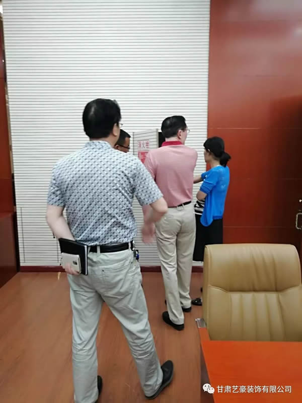 6月12日上午8:30,甘肃省建筑装饰协会秘书长李秀萍携飞天奖专家评审小组莅临中国农业发展银行甘肃省分行项目现场,在公司技术副总彭纪祖、项目经理杨博等陪同下,对我公司承接的“中国农业发展银行甘肃省分行营业办公用房室内维修改造工程”进行了考察评估。