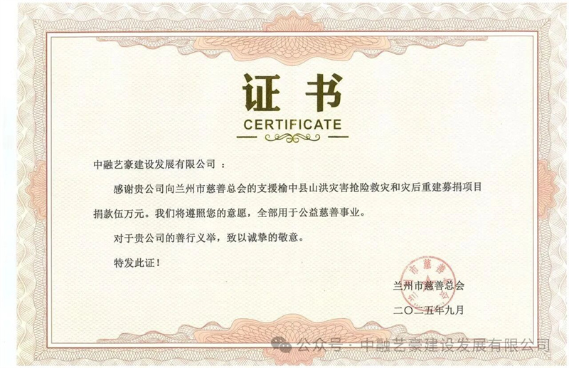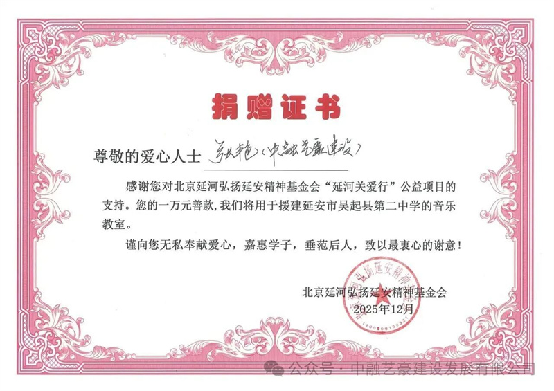 这一年,我们不忘来时路,常怀感恩心。在追求企业发展的同时,我们始终铭记肩负的社会责任。在张艳董事长的倡导与带领下,公司积极投身公益,通过切实的捐赠行动回馈社会,履行企业公民义务。兰州市慈善总会“情暖金城关爱特困群体慈善意愿捐赠”、兰州远大医院“旧衣暖心”捐赠、榆中县山洪灾害抢险救灾和灾后重建捐赠、北京延河弘扬延安精神基金会“延河关爱行”公益行动等,都凝聚着张艳董事长和全体员工的力量。这一份份源于责任与温度的担当,不仅传递了温暖与希望,更彰显了中融艺豪作为一个优秀企业26年来的价值追求与情怀格局。
